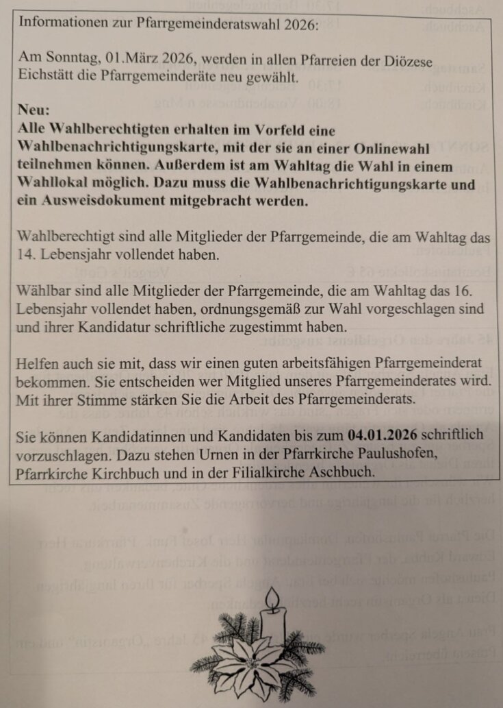 Am 1. März 2026 findet die Pfarrgemeinderatswahl statt. Wir freuen uns über schriftliche Wahlvorschläge, die in den Wahlurnen in unseren Pfarrkirchen in Kirchbuch und Aschbuch bis 04.01.2026 angegeben werden können.